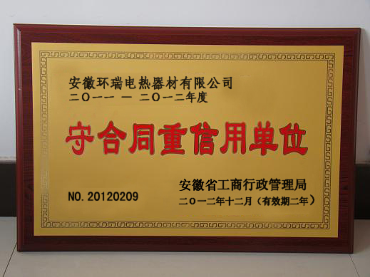 誠信是企業可持續發展的基石。十多年來,安徽環瑞電熱器材有限公司始終秉承“以人為本,以顧客為中心”的核心價值觀,恪守誠信經營的理念,嚴格執行《合同法》、《公司法》等法律法規,不斷強化合同管理,完善合同管理制度,從根本上保證合同管理和履行的規范性。同時,大力開展創造“守合同重信用”企業活動,營造“守合同重信用”的良好氛圍,提高全體職工“守合同重信用”的自覺性和法制觀念,使企業合同管理不斷走向制度化、規范化、標準化。2011-2012年公司合同履行率100%。無任何違法、違約、違規及合同糾紛等不良行為,各合作單位對安徽環瑞的合同履行情況也都給予了高度評價。