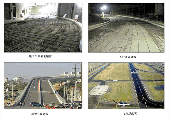 潔凈的人行路面,使人們活動無冰雪困擾;避免傳統道路除冰雪方式帶來的昂貴費用及除雪劑給路面帶來的損害 ;有效的融化坡道、階梯、直升機起降站和其它路面上的冰雪,清除危險,減少不便;