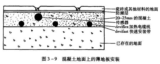 該系統是由可加熱柔韌電纜和感應器、恒溫器等構成,可劃分為兩類:一種是加熱電纜線,可廣泛應用于各種安裝區域;另一種是加熱席墊,用于薄地板、翻新后的地板。該供熱方式適用于任何材質的地面(見圖3一9、圖3一10),如木地板、大理石、瓷磚等。