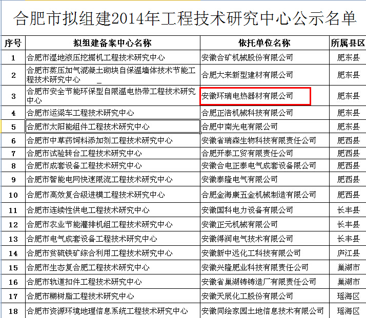 根據《合肥市工程技術研究中心管理辦法》要求,擬組建2014年合肥市工程技術研究中心,安徽環瑞電熱器材有限公司成功進入合肥市工程研究中心名單: