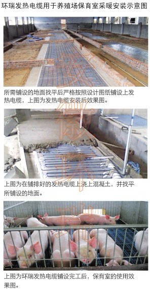 環瑞發熱電纜廣泛應用于養殖場分娩舍、保育舍的采暖,高質量的發熱電纜產品,使用非常安全可靠,避免了極冷冬天因天氣寒冷造成的乳、幼豬凍傷、凍死事故發生以及傳統的紅外線燈加熱溫度過高帶來的灼傷。相對于傳統的采暖,環瑞發熱電纜具備絕對的優勢。